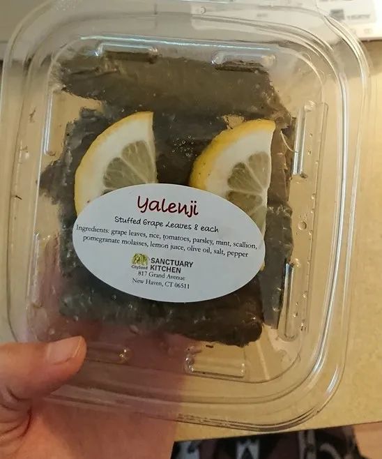 我在她们的摊位前纠结了一会,终于抵挡住土豆的诱惑,在剩下的几盒里挑中了yalenji(也叫yalanji) ——一种用葡萄叶裹大米做成的叙利亚开胃小菜,配料有番茄,欧芹,薄荷,薄荷,葱,又以石榴糖浆,柠檬汁,橄榄油,盐和胡椒调味。