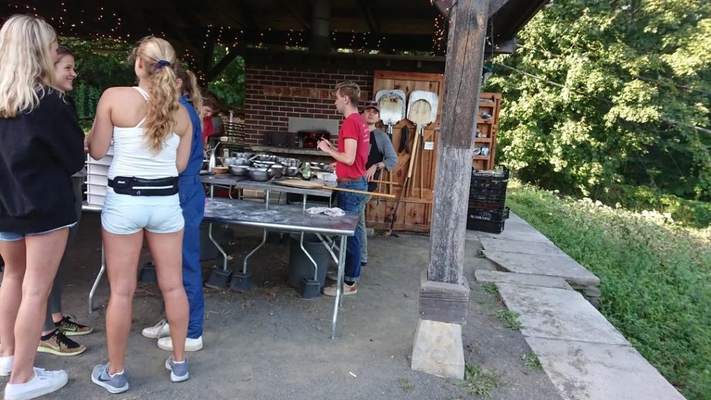 开放日的劳动结束后,学生干事和志愿者就可以一起围坐在长桌前休息,准备吃披萨了。没错,披萨面饼上的配料就是今天刚采摘好的新鲜果蔬。