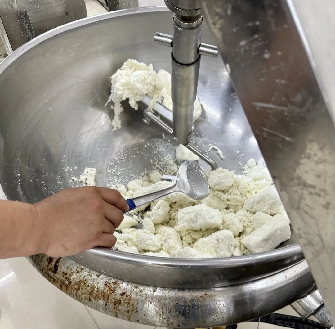 牛奶从凝乳变成奶豆腐的关键步骤是“出筋”,即将奶料加热搅拌至形似面筋,能够拉丝的、柔韧的绵软状态。