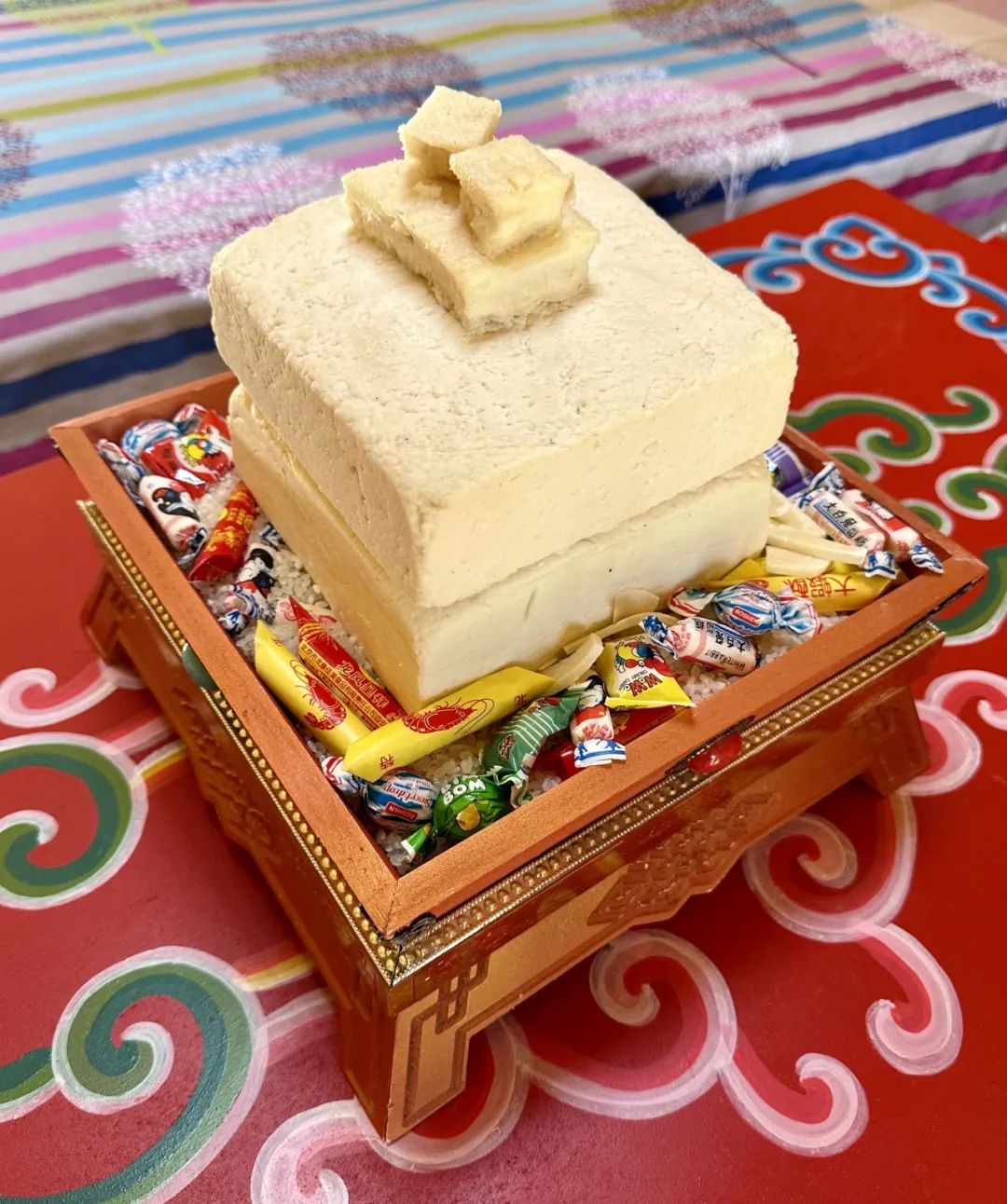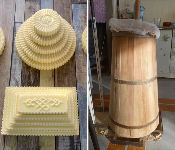 传统奶食工艺的木质工具由牧民亲自选材、亲手制作,刻着纹饰和蒙文字符的奶豆腐模具尤其精美。木材不光好看,还可以吸收乳糖对奶食进行“二次发酵”。在很多地区,木桶都是发酵酸奶和搅打黄油的不二之选。