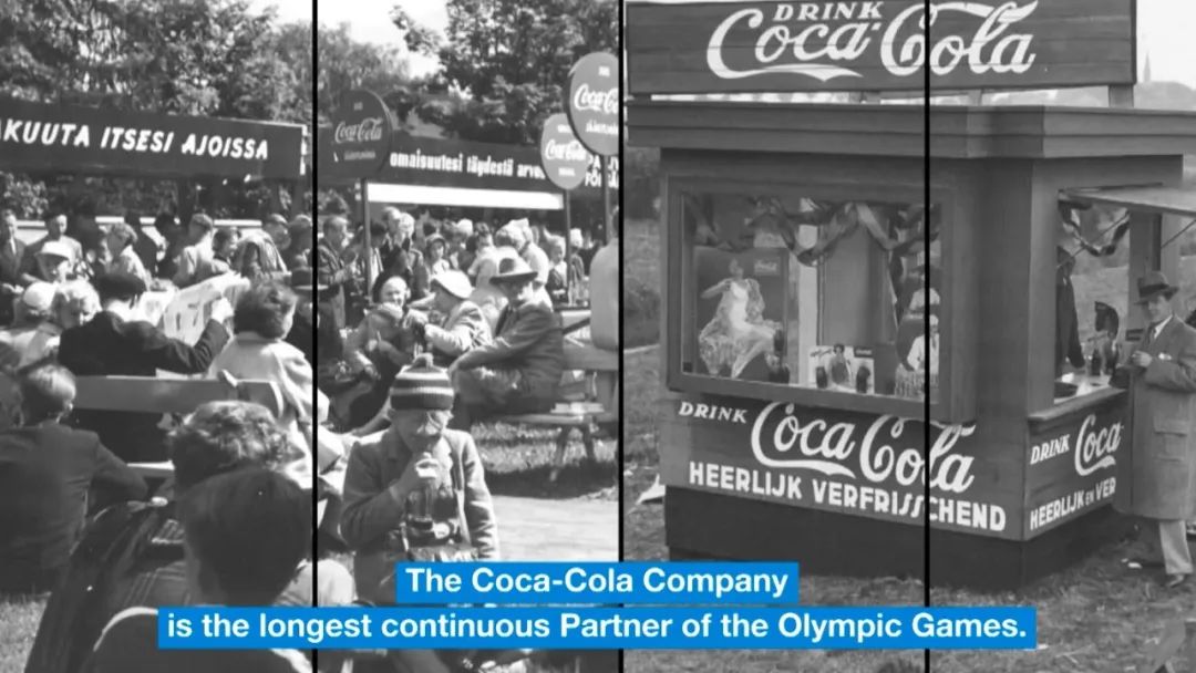●上图:1928年可口可乐赞助阿姆斯特丹奥运会。下图:2024年巴黎奥运会,可口可乐和中国乳企蒙牛以联合赞助商的身份高调露出,两家公司2021-2032年期间奥运会赞助总额估计为30亿美元,折合人民币约214亿元。图源:国际奥委会视频截图