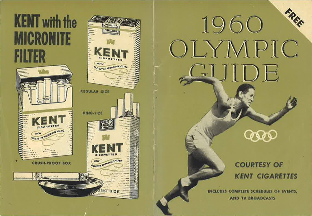 ●1960年奥运会的健牌(Kent)香烟赞助广告。80年代后,烟草广告逐步被各大体育赛事“封杀”。如今,饮料巨头们也害怕步烟草公司后尘。