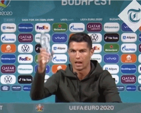 然而,意识到含糖饮料危害的顶级运动员已经开始对“饮料巨头”说不。2020年,著名足球运动员C罗在欧洲杯的一场新闻发布会上,移开了面前的两瓶可口可乐,举起桌上的一瓶饮用水,说了一句“喝水”。