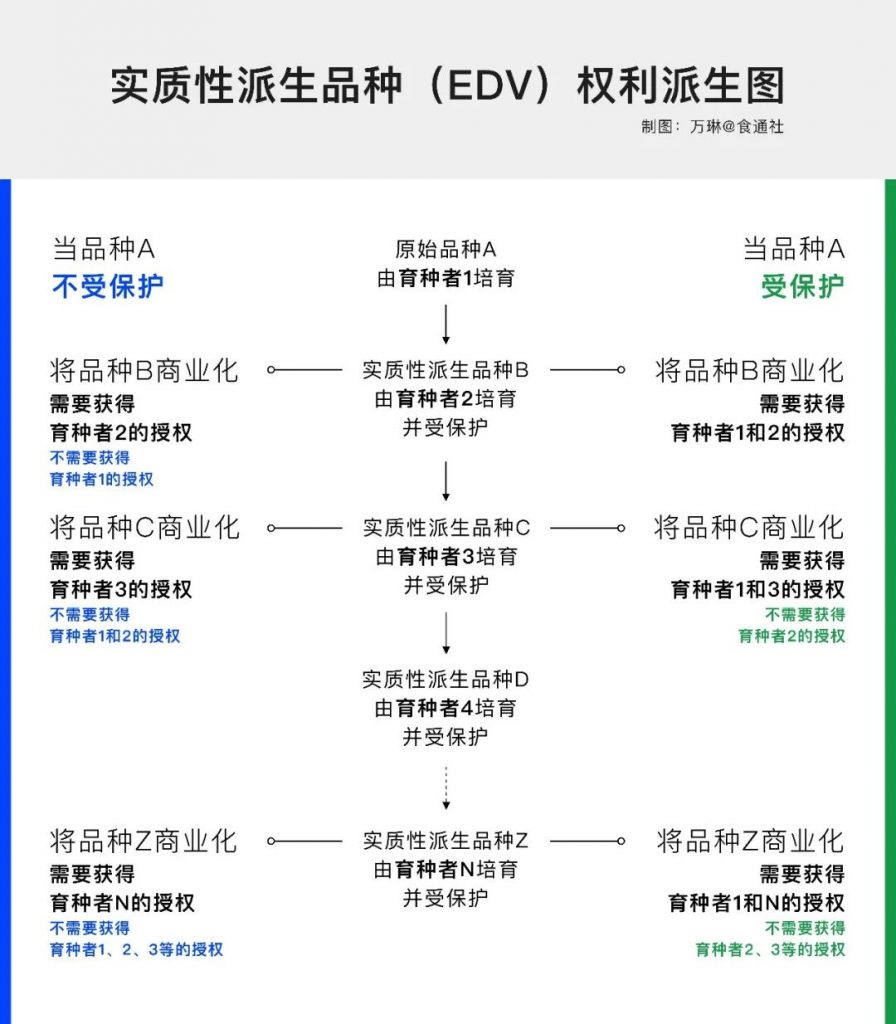 根据新修正的《种子法》,如果一个品种被认定是EDV,它的生产、繁殖、销售等都需要征得原始品种新品种权所有人的同意。也就是说,在我们的故事中,假如C被认定是由B派生而来的EDV,李四想要卖出种子C,就需要王五授权。但显然,王五不可能免费答应李四的请求,这就给了前者要求分配权益的机会。