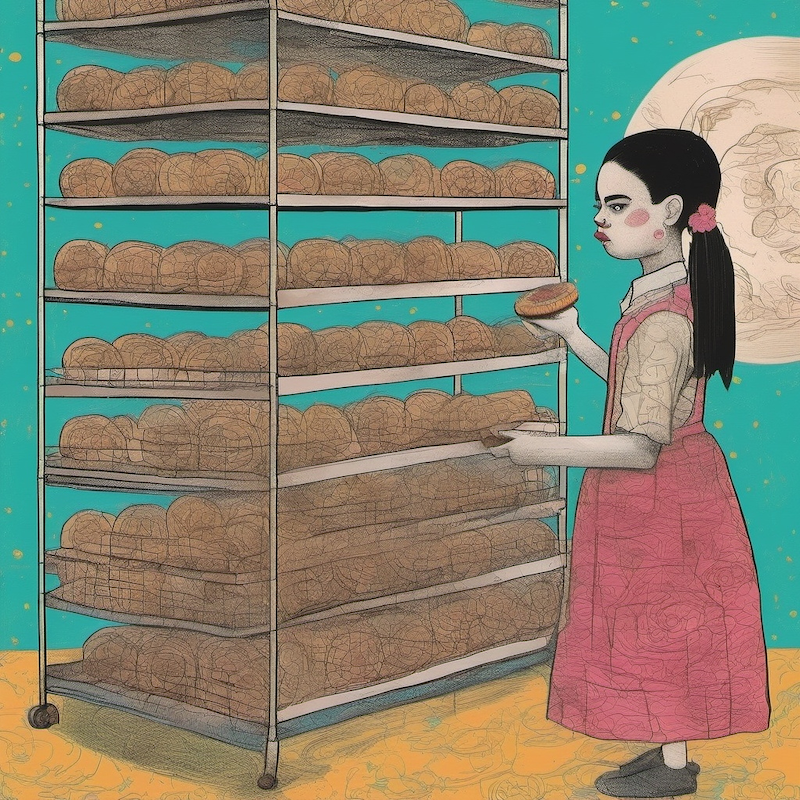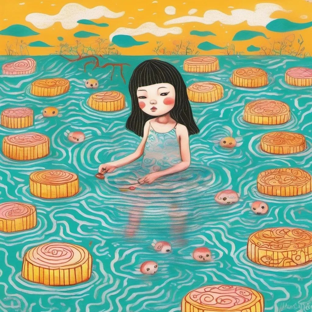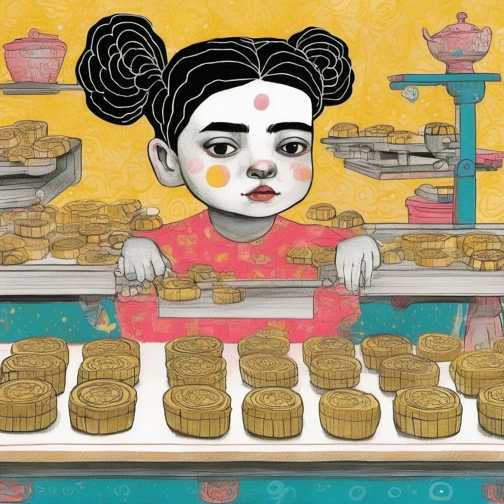 有一段时间我尤其喜爱守在流水线旁边,听着机械运行的嗡嗡声,还有模具有节奏的打击声,感到一切都那么有序和安稳。有的时候看着传送带出神,会产生失重与飞跃之感,仿佛自己竟是一颗月饼在银河中游荡,后来上了物理课,才晓得这是“相对运动”。沈复《浮生六记》里是熏蚊子做青云白鹤,我则是数月饼游银河太虚。用现在的流行话语来说,大概是产生了“心流”。而为了找到产生这种奇妙体验的发生机制,我连天跑到生产线上试图复刻,后面终于发现关键的变量是要眼神虚焦,然后微微翻起斗鸡眼。我终于在斗鸡眼将要定格之前,戒断了这个爱好,兴趣点已然转移到烤月饼。