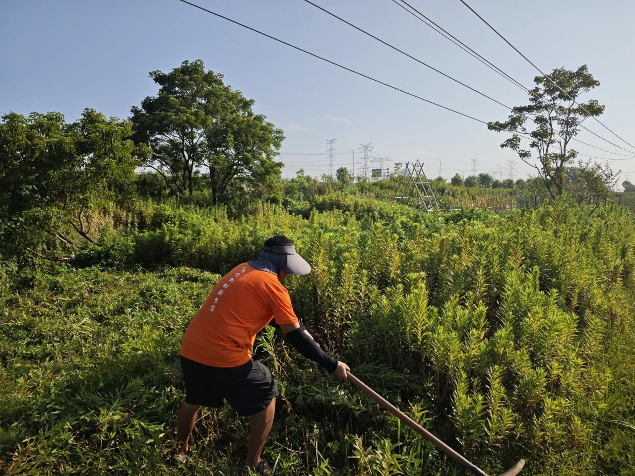 那几天我们的主要工作是除草。割草机只能处理一些低矮的草,成片的加拿大一枝黄花都需要靠人工,使用镰刀或者电锯。袁老师耐心地纠正我的动作细节,待我逐渐熟练,一刀下去,一排植株倏然倒地。一种油然而生的战意罔顾汗流浃背、精疲力竭,驱使我踏着断枝不停地向荒地深处推进。这是比常规农业更决绝的敌我关系:实际的生产需求升华为道德使命感。