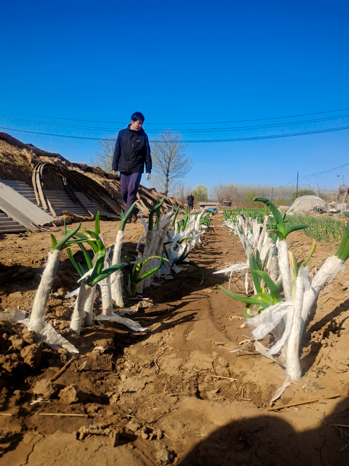 试种一年,效果不错。李大叔又从邻镇寻摸来另一个葱身细,但葱白儿更长的品种,想着让地里的葱“粗上加长”,便将两种栽到一块,让它们相互授粉,边种葱边搞起了“育种”。同样的光热水肥伺候着,那些长得更高更壮的便是大叔瞄上的留种对象,每年入冬前他负责选出健康结实的种葱,打成捆,堆放在库房一角,等第二年开春一化冻就又栽回地里。他说,栽之前最好剪去上半截的茎叶,这样日后好开花。怪不得上回跟着大叔学育苗时,看见好些个半截子葱冷冷地戳在地里,原来都是种子选手!随着它们滋芽,抽薹,一直等到5月末开出的花球成熟,便可剪下装袋,阴干后上面的种子很好脱落。如此,把自己挑选出的精锐部队收集起来,来年再战,李师傅的干劲更足了。