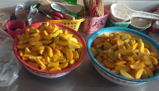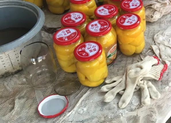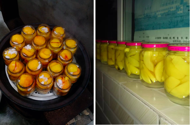 有一种桃不太一样,黄桃。黄桃酸牙,直接卖的话价格较低,适于做罐头。过去,家里种黄桃多是为了卖给罐头厂。因为老农民不擅于给水果做加工,做不好的话水果也容易坏。不知从哪年开始,电商发展起来后,加工产品有销路了,也突然有人会做罐头了,于是教会了一批人,一阵做罐头的风潮便开始了。村里的人常常是自己做、自己吃,多了的也送给城里的朋友,有富余的罐头也还能卖出去。