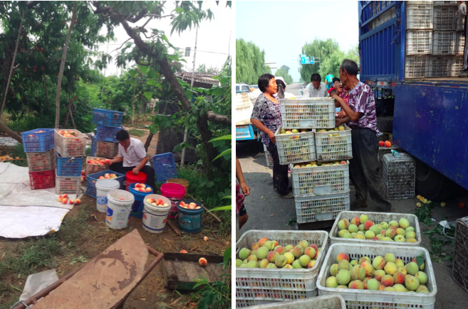 桃子有好吃、适口的,也有不好吃、不适口的;有好看但不好吃的,也有不好看但好吃的。卖桃有四种方式。最传统的是卖给收桃的中间商,这种方式农民能要的价最低。其次是直接送到北京最大的批发市场——新发地,这要比直接卖给中间商的价格高出不少。再之后就是去传统集市上卖,比新发地的收购价高些,但销售的数量也有限。最后是近三年兴起的上门生鲜,俗称:快递桃、飞机桃。走这个门道,桃子按个按箱卖,价格的确能卖高一点,但同时也需要农民会营销、认识渠道。