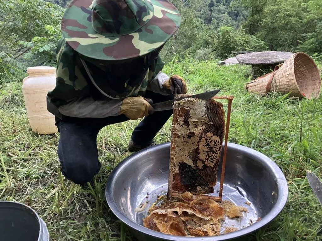 而村民会利用蜜蜂分蜂的现象,用糊上牛粪和蜂蜡的竹编罩,模拟蜜蜂喜欢的自然环境,以此引诱蜂群在蜂箱里安家。所以4月也是他们最忙碌的时候,每天都要到蜂场观察分蜂。