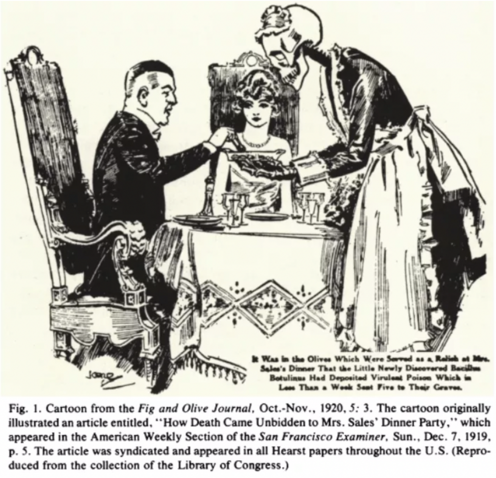 1919年,在美国俄亥俄州,七人因食用含有肉毒杆菌的橄榄罐头而身亡。随后的几个月里,其他几个州也出现了有毒的橄榄罐头,随即引发了美国全国对于罐头食品安全性的担忧。