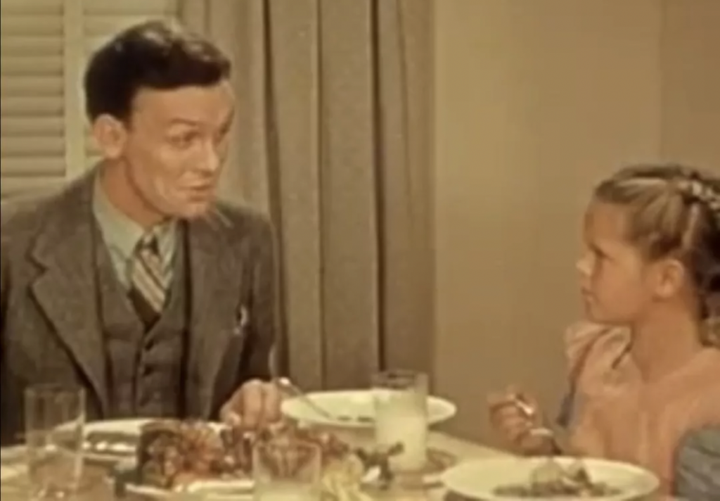 ●1936年上映的影片《摘豆子》(Pick of the Pod)。画中的小女孩在问爸爸,罐头里的豌豆是怎么长大的?父亲给她讲他童年在农场摘豌豆的故事。新一代美国人仅能通过罐头接触到豌豆,父辈关于这种作物本身的知识就更难以传递下去。