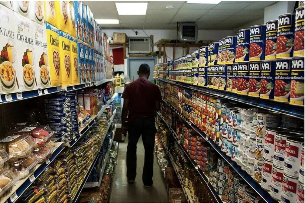 ●北美超市中堆满货架的罐头和包装食品。图片:孙珊