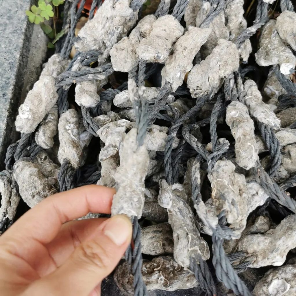 这种蚝绳,便是用塑料绳子串起一堆石头块,用来替代原来的水泥柱。水泥柱不好移动,插在滩涂地里,遇到风浪容易倒,遇到海泥容易被淹没。绳子,则更灵活,还可以吊在棚架上,垂于海水中。