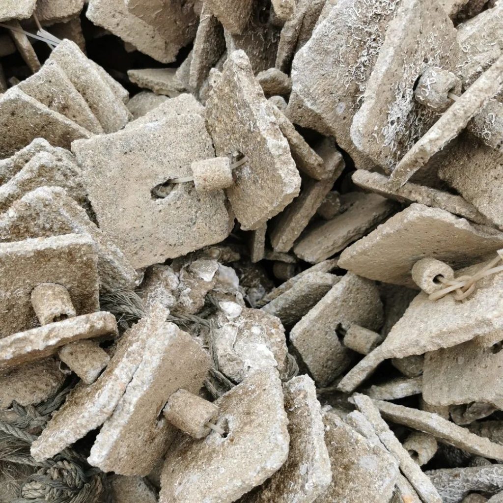 虽说是“养殖”,实际上只是想办法做出各种款式类似水泥、石头的“粗糙物件”,从而增大蚝的附着量。按照赤溪蚝民们的说法,养蚝完全是一项“靠天吃饭”的工作,暂时没有办法通过人工干预的方式让蚝长得肥美。