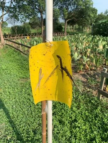 最近几天,我的工作是给每块菜地挂上黄色的粘虫板。我边挂板子,边观察上一批板子上捕获的昆虫。