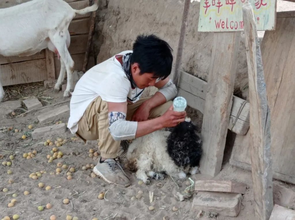 除了种瓜,我最喜欢的是喂羊。刚来农场时,农场只有两只羊,后面母羊生了一只小羊,再后面,师父又买回来两只从牧区退下来的残疾小羊。我每天给它们喂草,饮水,还给最瘦弱的那只小羊喂奶。我能感觉到它们从内心中召唤着我牧人的心灵。