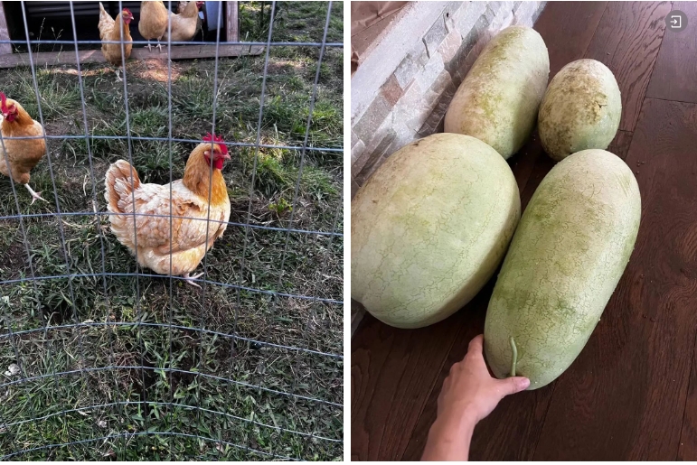 ●我的后院走地鸡和用鸡粪施肥种出来的西瓜。点击图片阅读我的种地故事。