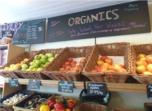 〇独角兽在店铺骄傲地宣布:我们所有的水果和蔬菜都是有机的。
