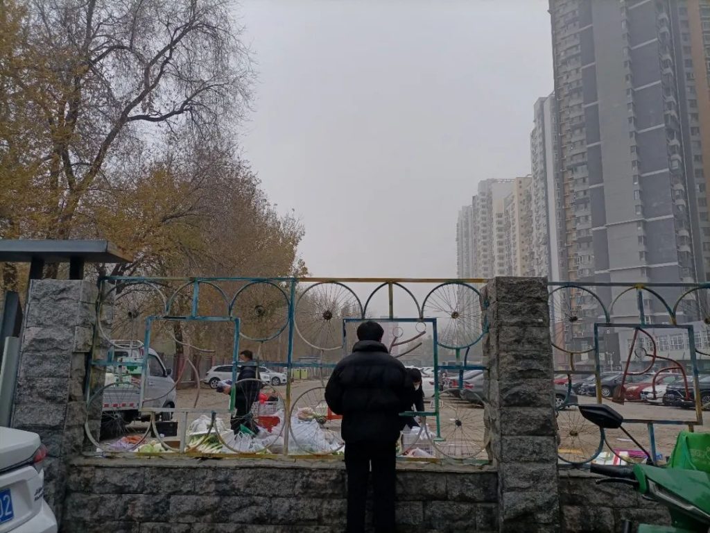 ●11月24日,北京朝阳多个小区被划为临时管控区,被管控的菜贩隔着栏杆继续卖菜。图片:食通社