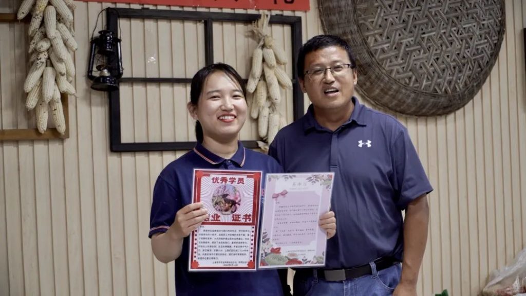 ●“生态农业实习生计划”的结业时刻,李钰和导师袁清华。图片:多多