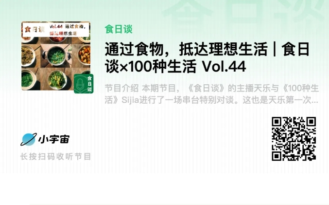 本期节目,《食日谈》的主播天乐与《100种生活》Sijia进行了一场串台特别对谈。这也是天乐第一次在播客里谈到自己如何从国际新闻专业毕业的媒体人,成为一个和农业、食物打交道的公益人,以及她所理解和践行的理想工作和生活。
