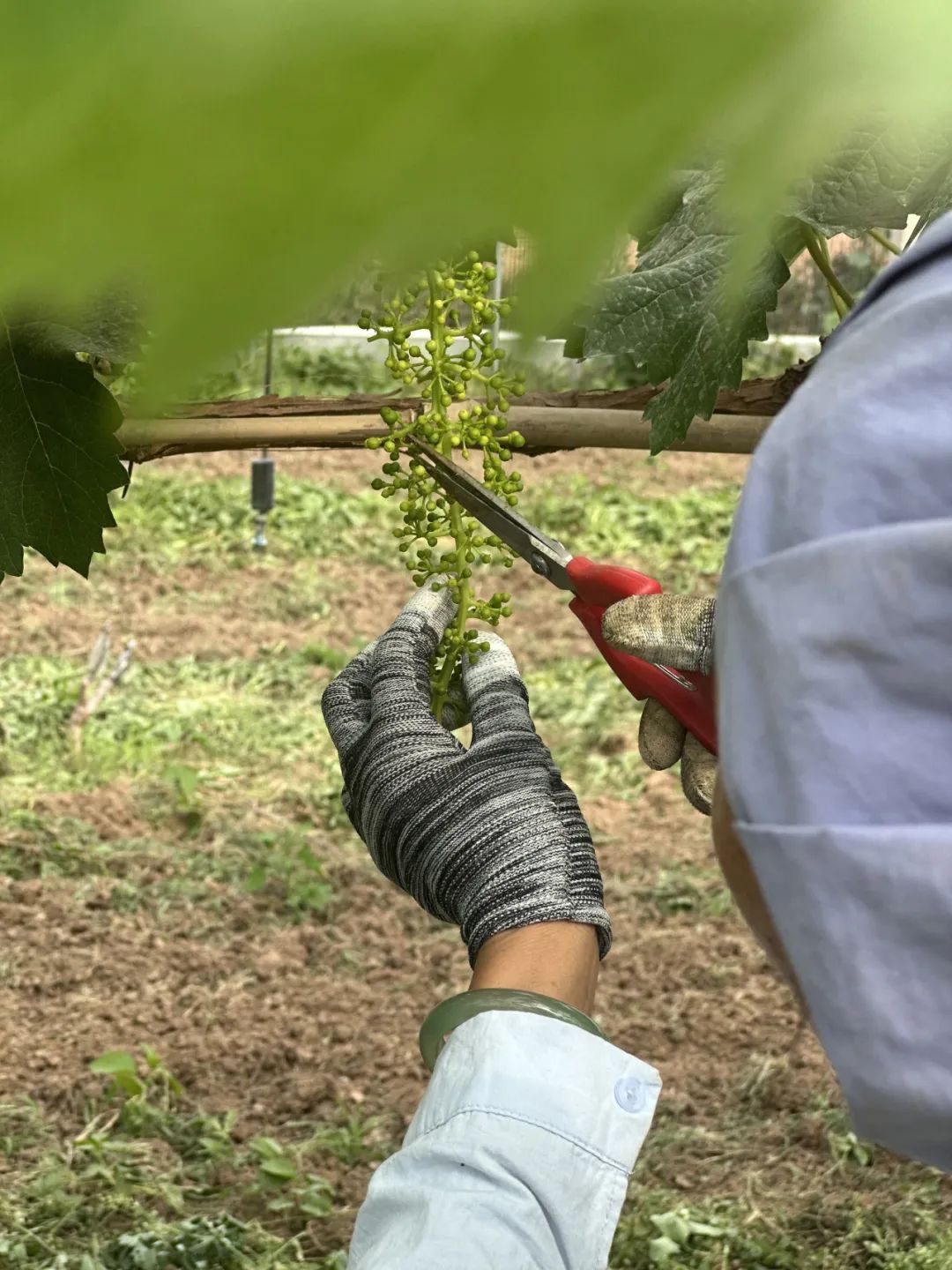 待葡萄结出一簇簇如绿豆般的果粒,就要开始修果了。这活计非常麻烦,需要极大的细心和耐心。要剪掉每个小串朝上和朝下生长的果粒,只留出平行方向的果粒。而且修出整串由上到下、逐渐收窄的廓形,这样长大的果实不会互相挤裂,卖相也好看。