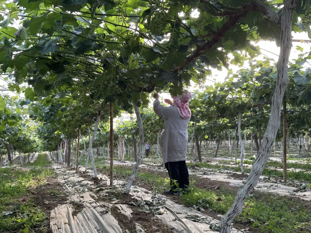 女工们给徐元林的果园修完花,就转移到40公里外天王镇的一家果园继续劳动。我在那里见到了这群女工。她们穿着宽松透气的长衣长裤。每人戴一顶渔夫帽,脑后垂一块布遮住脖子。她们并不像本地村民喜欢扎在一堆,边说话边干活,而是分散开,一人沉默地修剪一行葡萄。小剪子灵巧地一张一合,不疾不徐。剪掉的果粒落在地膜上的声音滴滴答答,像是在下雨。