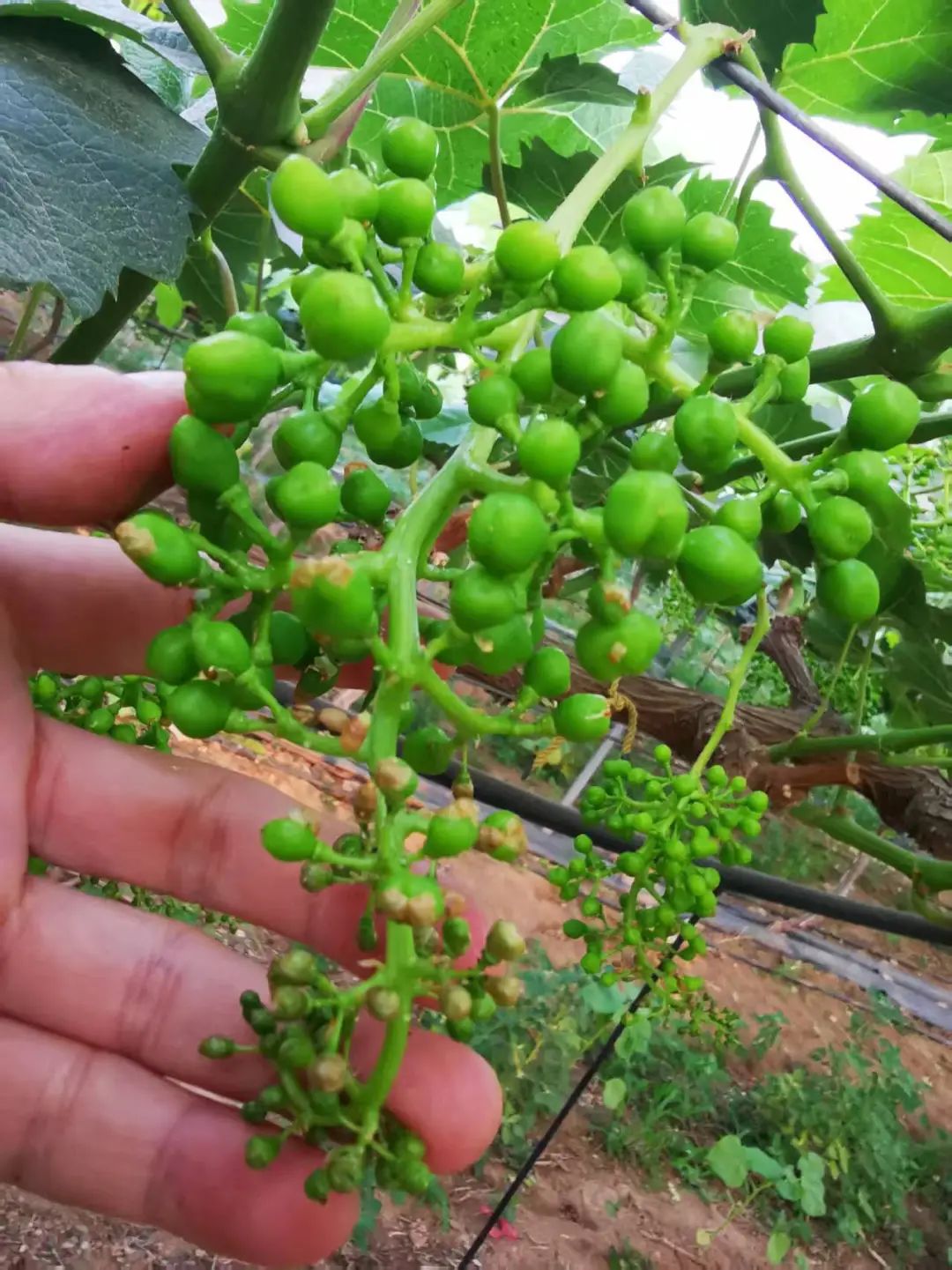 他的葡萄发育状况明显比徐元林的要好:更大,更饱满,色泽鲜亮。这是因为果园位于塬上,园子里的通风条件较好,因此虽然开花早,但整体温度相对较低。