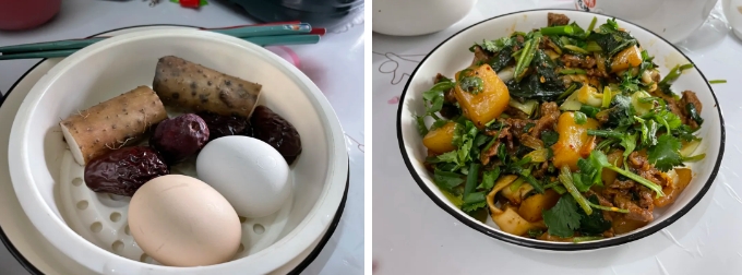 午饭和晚饭,一天至少做一顿,勤快的时候两顿都自己做。“我现在有一个做法,把米饭、肉、蔬菜,就是土豆、胡萝卜那些,都放在电饭锅里一起煮。”