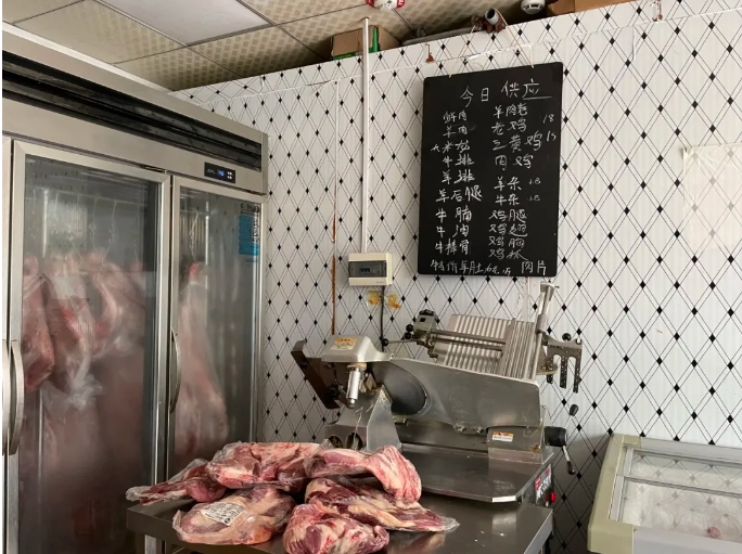 老板夫妇来自甘肃,2019年到这里开了清真商店,给周边的清真餐馆供应肉品和粮油副食。墙上贴着价目表,牛羊肉和普通市场上三四十元一斤的价格相差无几。