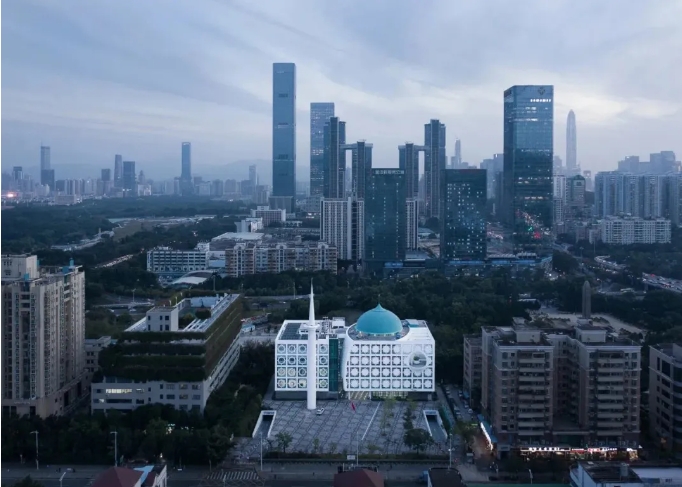 白绿双色的主体建筑跻身于周围暗调的建筑群中,洁白得发亮,融合了伊斯兰文化的现代式建筑风格,合格地衬托着深圳的定位——“多元包容的国际化大都市”。