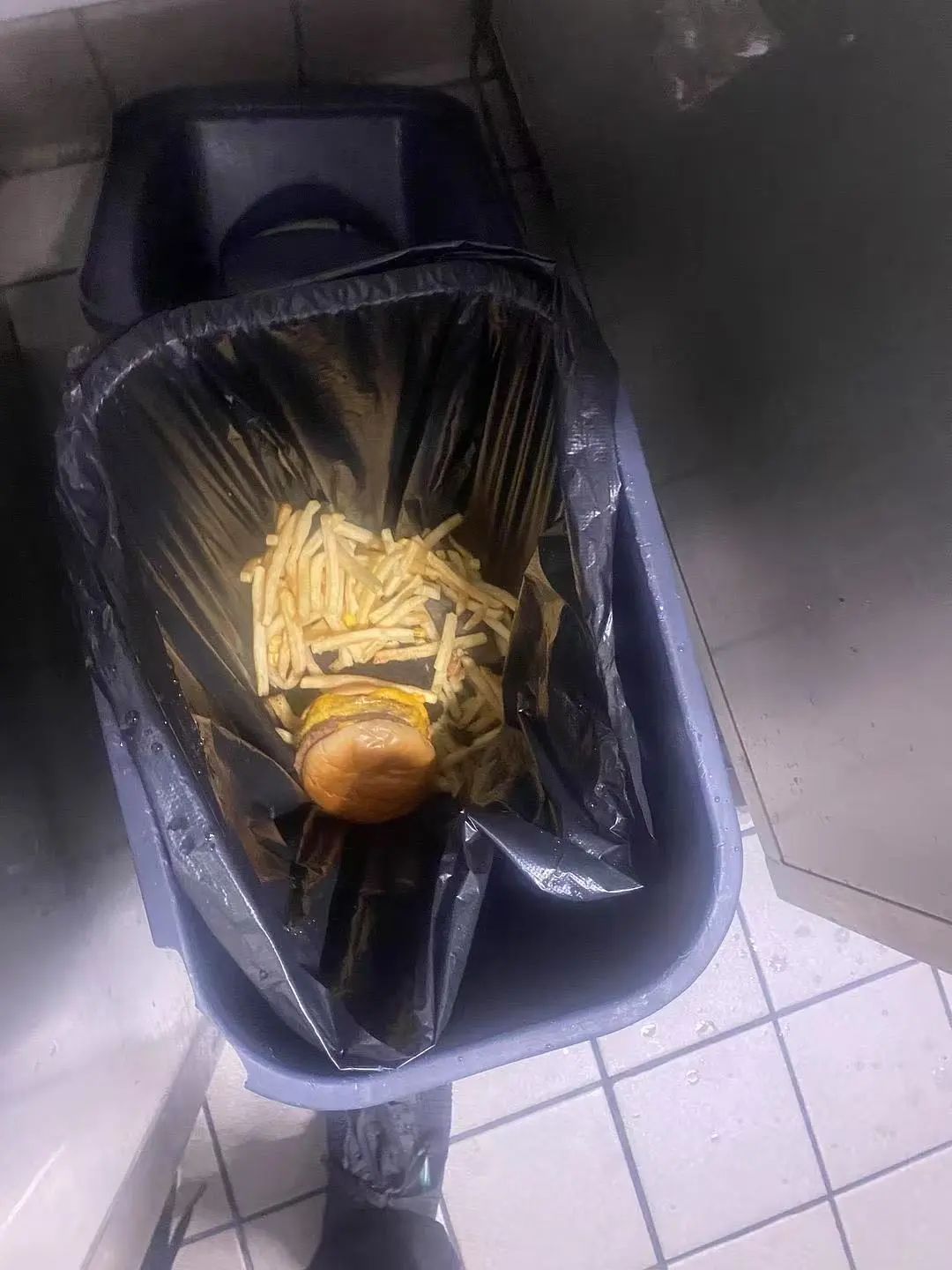 有次我收盘子时,看见一个大哥一个人留下一桌吃的,有几个最贵的汉堡,还有菠萝派和薯条,有的被他掰开看了看,菠萝派还在包装里动都没动。我感到不可理解,但也只能过去收拾餐桌。可要把它们倒进垃圾桶时,又觉得很可惜,就把袋子拿了回来。犹豫半天没敢吃,胡思乱想要是中毒了怎么办?吃掉以后更是紧张,还思考了半天自己会不会死。