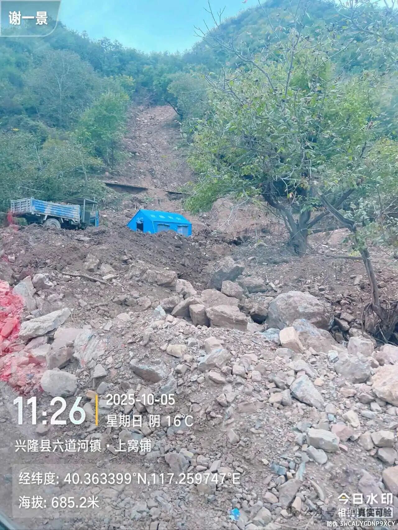 兴隆县暴雨红色预警是凌晨两点多发布。杨家台村所在的小流域,暴雨其实是三点多才开始下。到了四五点钟,降雨的极端性打破了山顶高位的岩土平衡,上游高处多个分支沟谷同时爆发山洪和碎屑流。一大部分汇集到了杨家台村四组和五组前,先冲毁了沟底的几栋房屋和院墙;一小部分汇集到四组村后的山洪沟里,从那里随后荡平了四组大部分房屋田地。