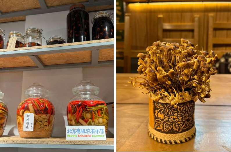 店里那些神奇的小物件:标着“非卖品”的四川泡菜和一盆自然风干了的金针菇盆栽。图源:李晔