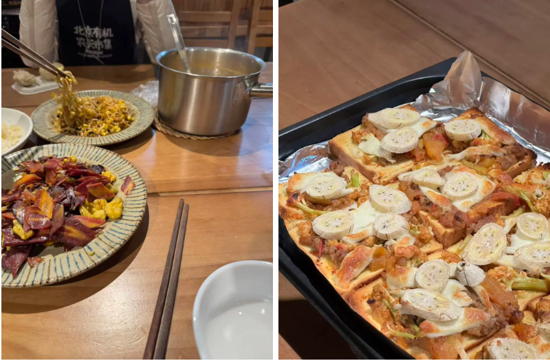 在需要自己做饭的社区菜店工作到底吃什么?左图:表姐当班做饭的一天;右图:集室的同事用吐司烤的披萨。图源:黄晨、李晔