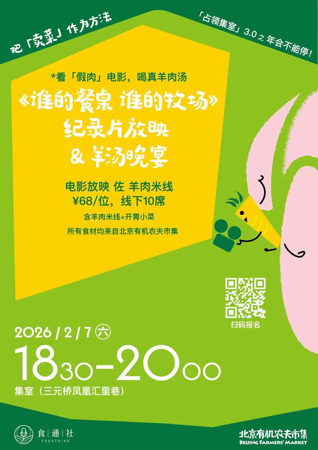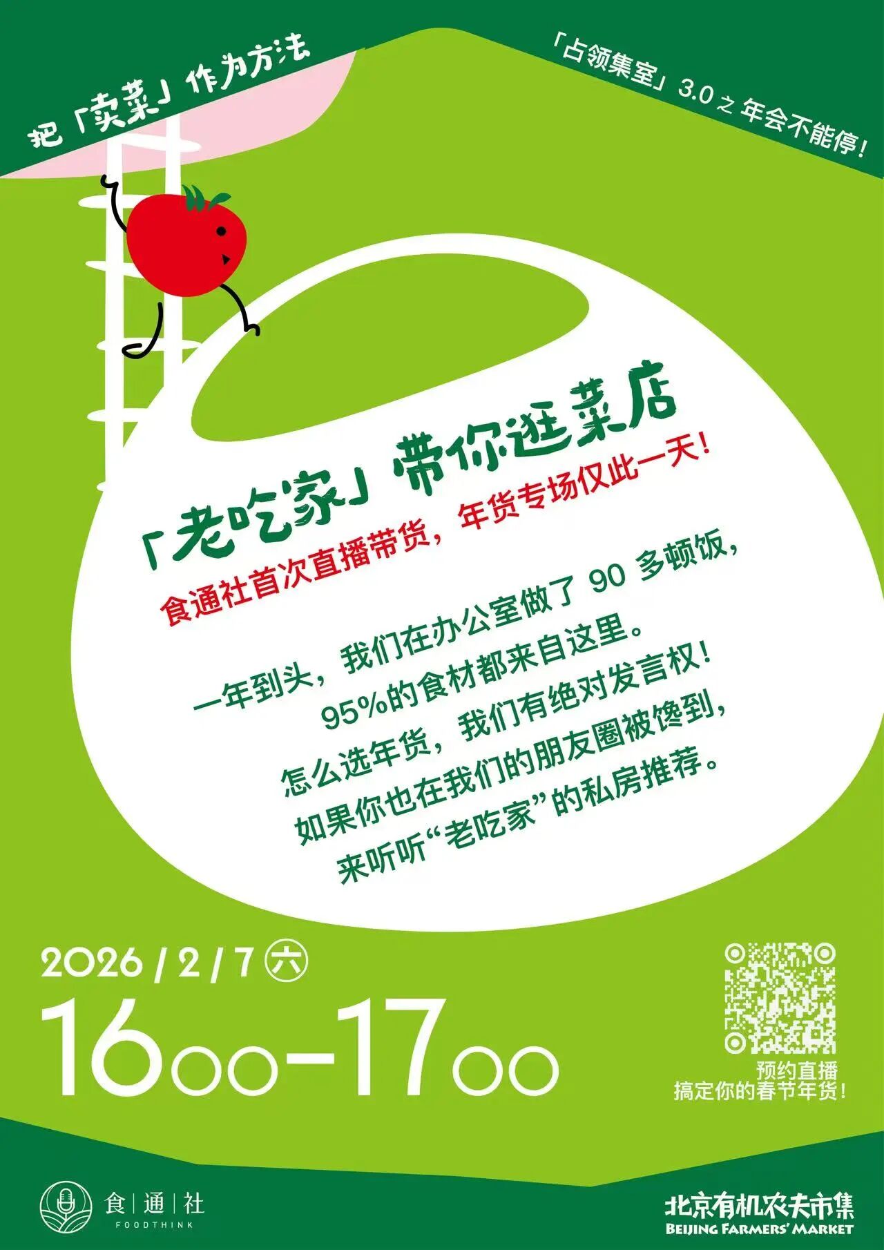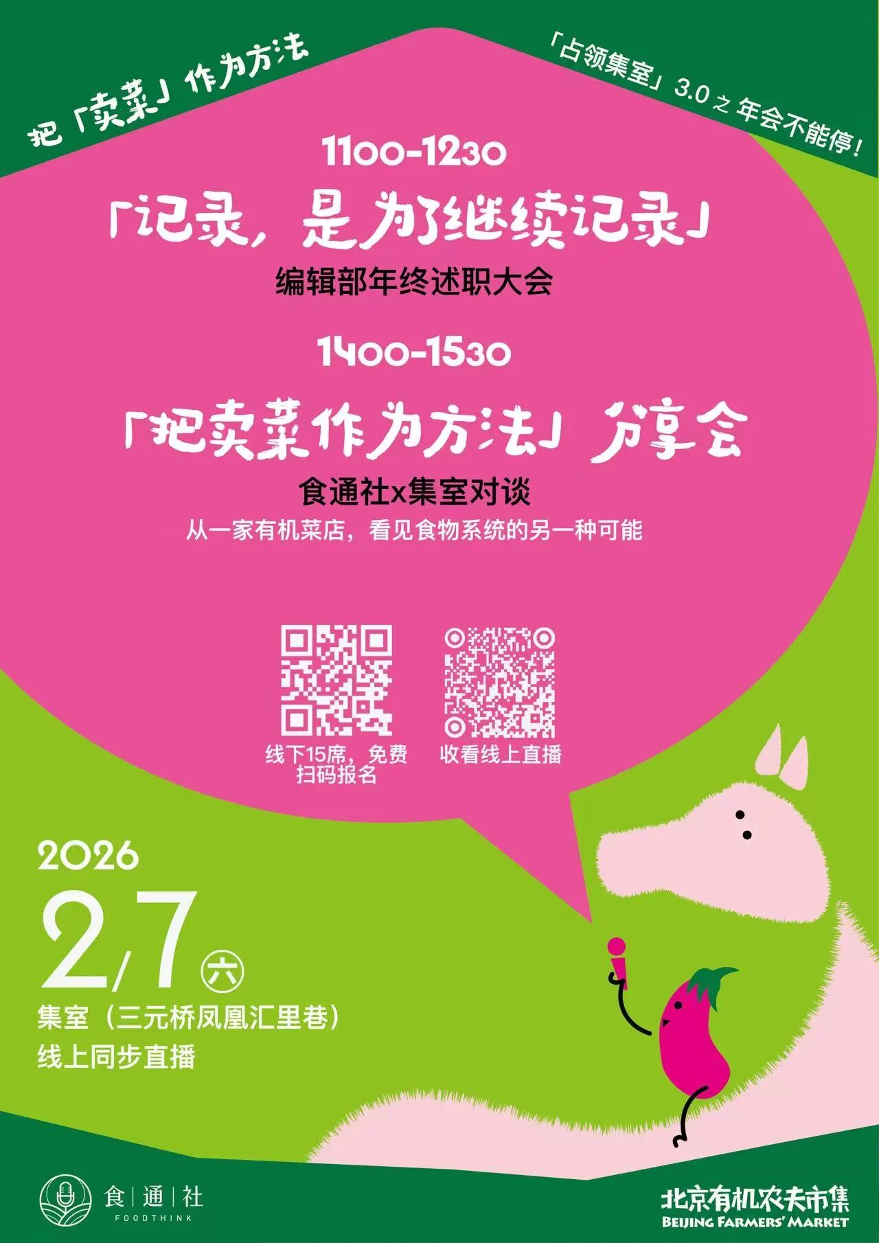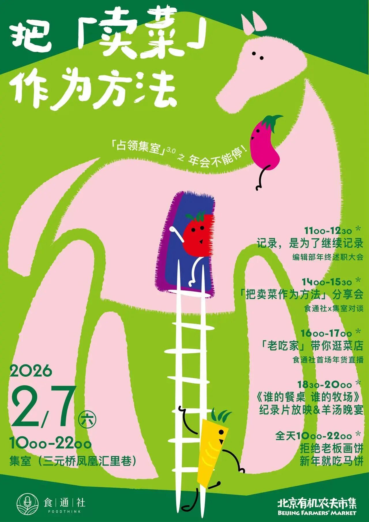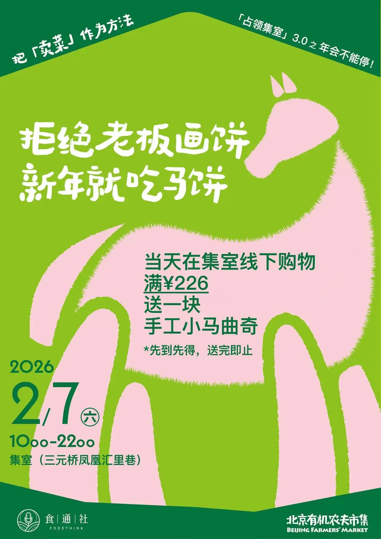 无论是想来检测我们卖菜的业务能力,还是想和食通社线下见面、顺便买把好菜,2月7日周六,欢迎各位“精神股东”光临三元桥·里巷,我们“马”上见面!