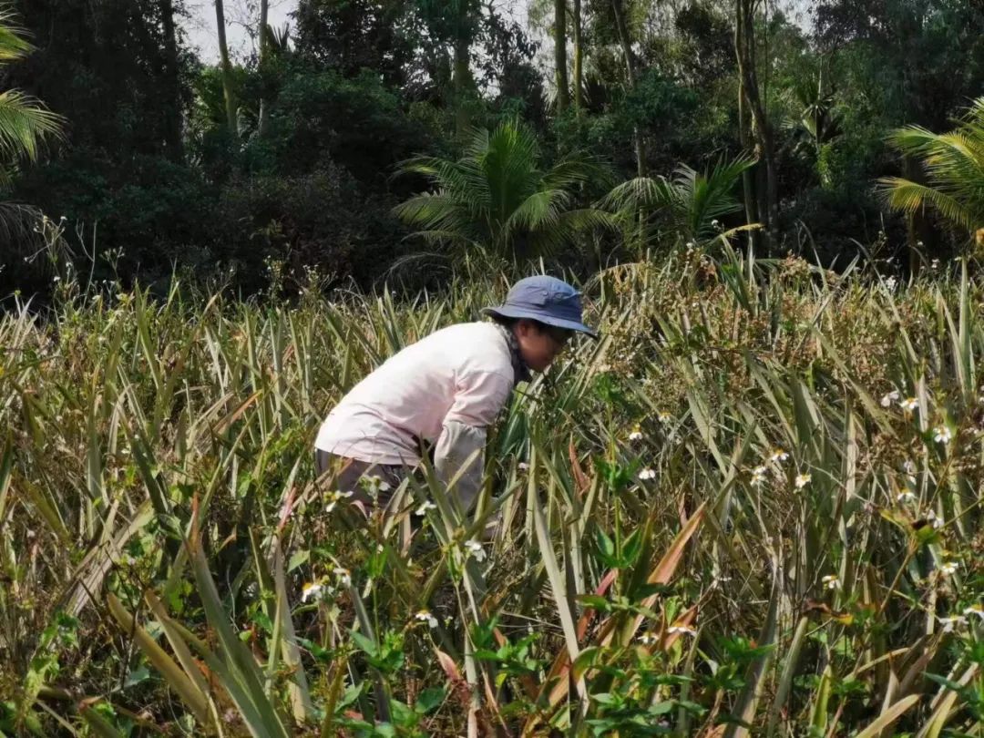 “ 来到农场一周多,体验了不少农事活动,印象最深刻的是给菠萝地锄草。锄草过程过于艰辛,即使做好防护,依旧防不了被鬼针草、菠萝叶和爬得很高的含羞草扎,不禁感叹:吃个生态菠萝也太不容易了!
